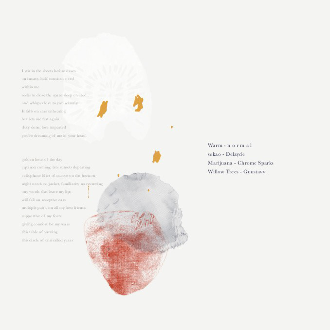 As part of a brief for University, I was required to design a vinyl sleeve/cover for a collection of songs. I based my music selection and designs off the song 'Warm' by n o r m a l, which emanated a personal feeling of comfort and peace. This design aims to communicate those feelings, inspired by the sweaters and layering of winter and explores the knitted, crocheted textures associated with this. The poem on the back sleeve was commissioned from a friend, describing the feeling of warmth when in love and surrounded by those one is close to. The design has then been incorporated into banners and patterns that continue these themes for external client use.